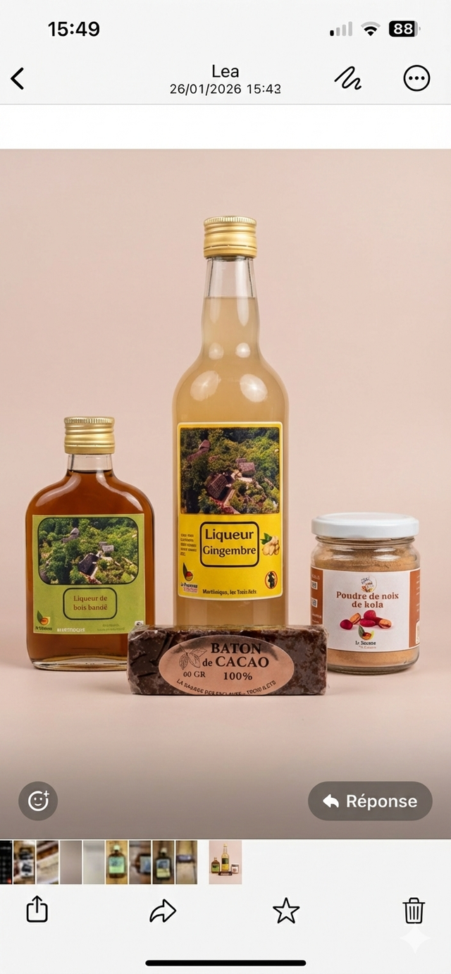 Liqueur de gingembre 500ml - liqueur de bois bandé 200ml - bâton de cacao 60g - poudre de noix de kola